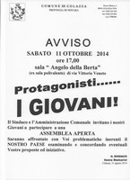 Sabato 11 ottobre 2014 alle ore 17,00 presso la sala comunale "cav. Angelo della Berta" di via Vittorio Veneto (ex sala polivalente) il Sindaco e l'Amministrazione comunale propongono un'assemblea aperta in cui affrontare con i Giovani problematiche inerenti il vivere Colazza per esaminare e condividere proposte ed iniziative.